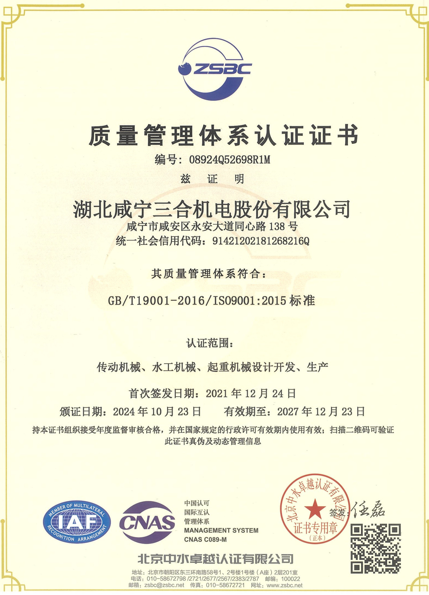 質(zhì)量管理體系認(rèn)證證書
