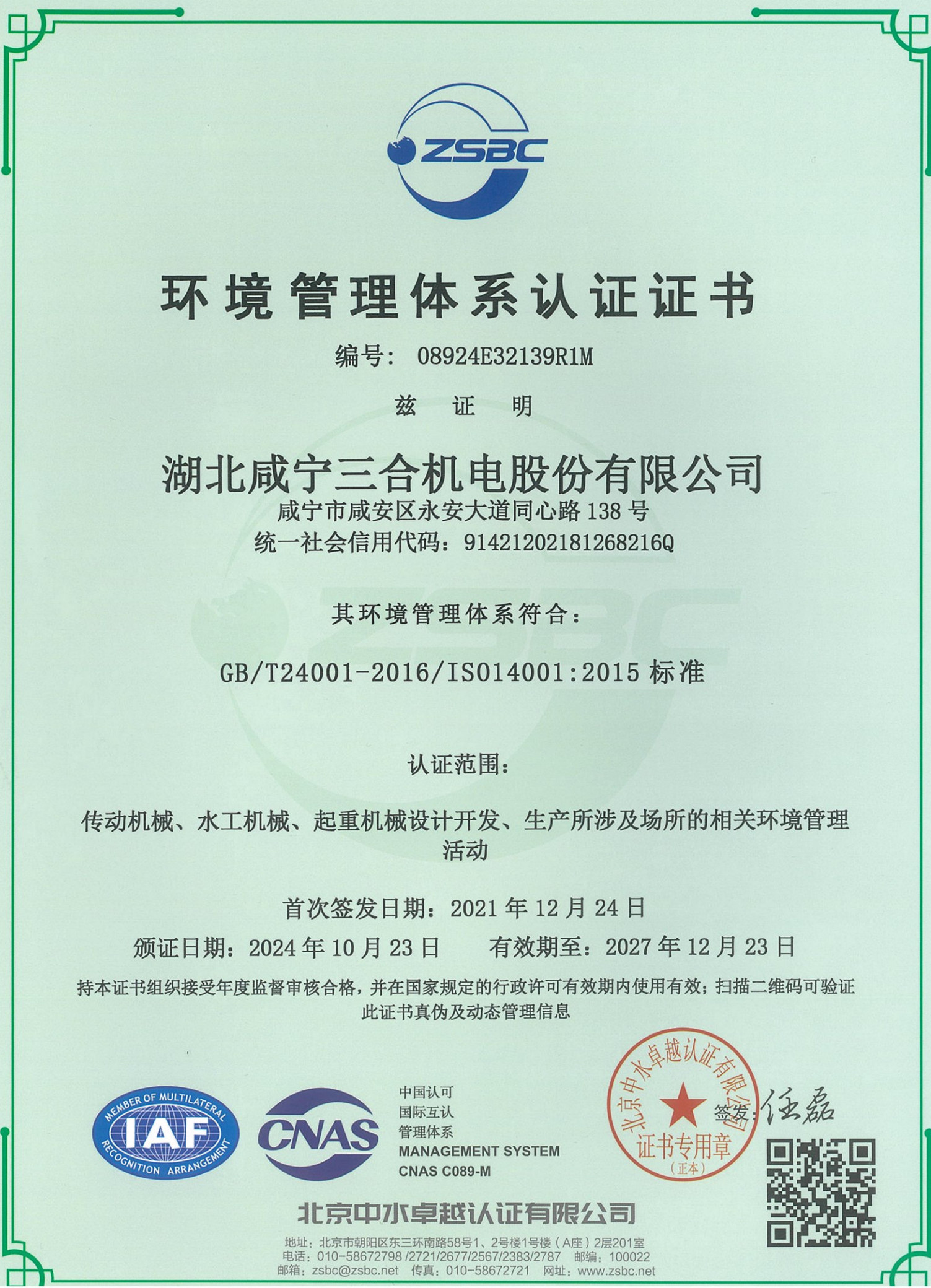環(huán)境管理體系認(rèn)證證書
