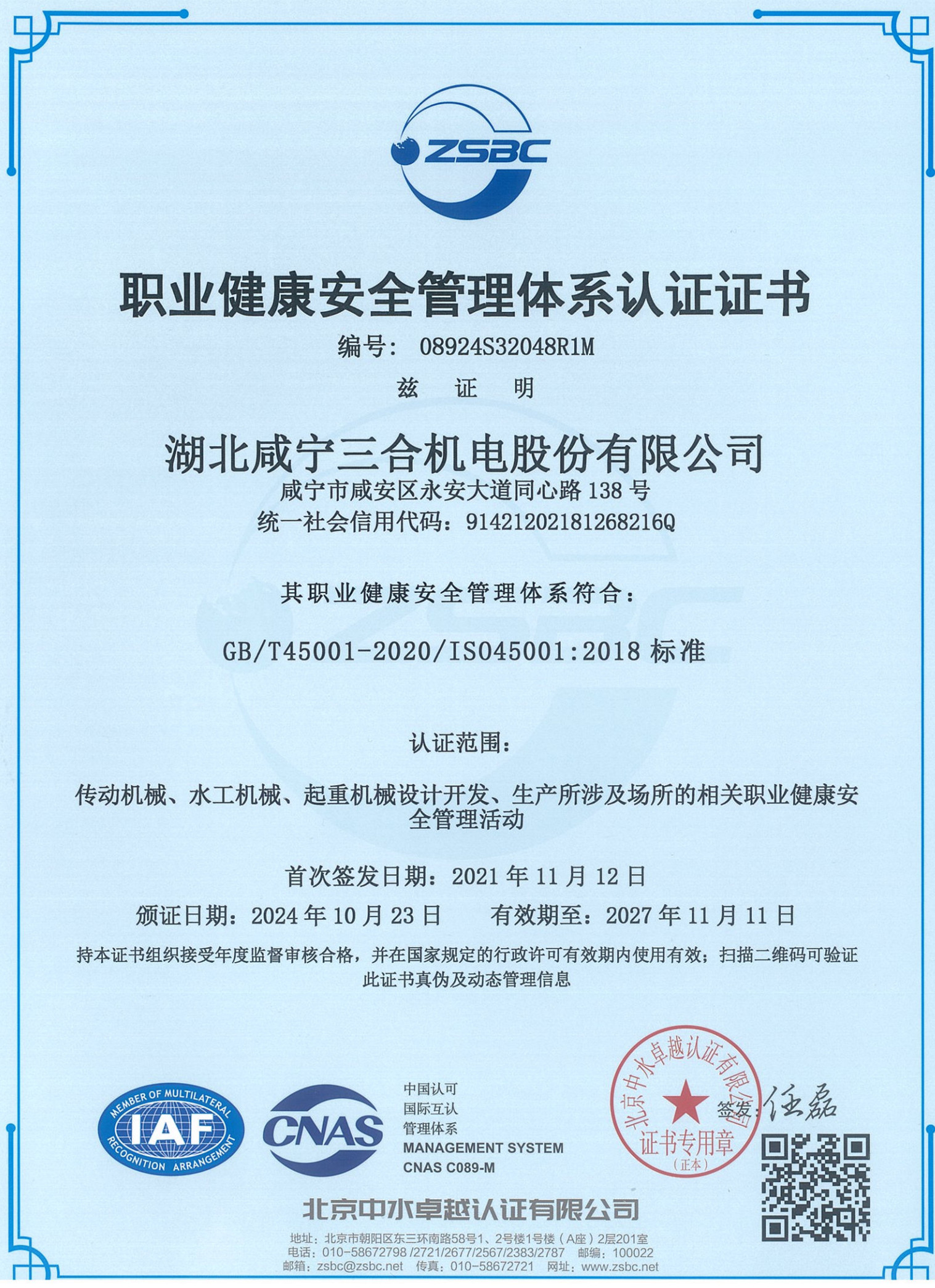 職業(yè)健康安全管理體系認(rèn)證證書